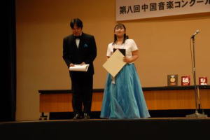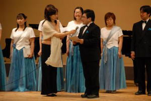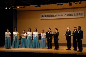 ちなみに、「中国」といっても、地方ではなく、 銀行でもなく、チャイナの方です。 昨年のコンクールで取り上げた 中国民謡を歌ってきました。 金賞、兵庫県教育委員会賞を 受賞することができました。 演奏会の前にまず、表彰から。 |