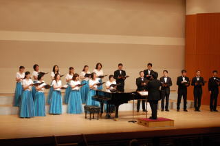 最終ステージは、合同ステージ 岡山大学グリークラブ有志の方も賛助に 加わり、「花に寄せて」を全曲演奏しました。 |